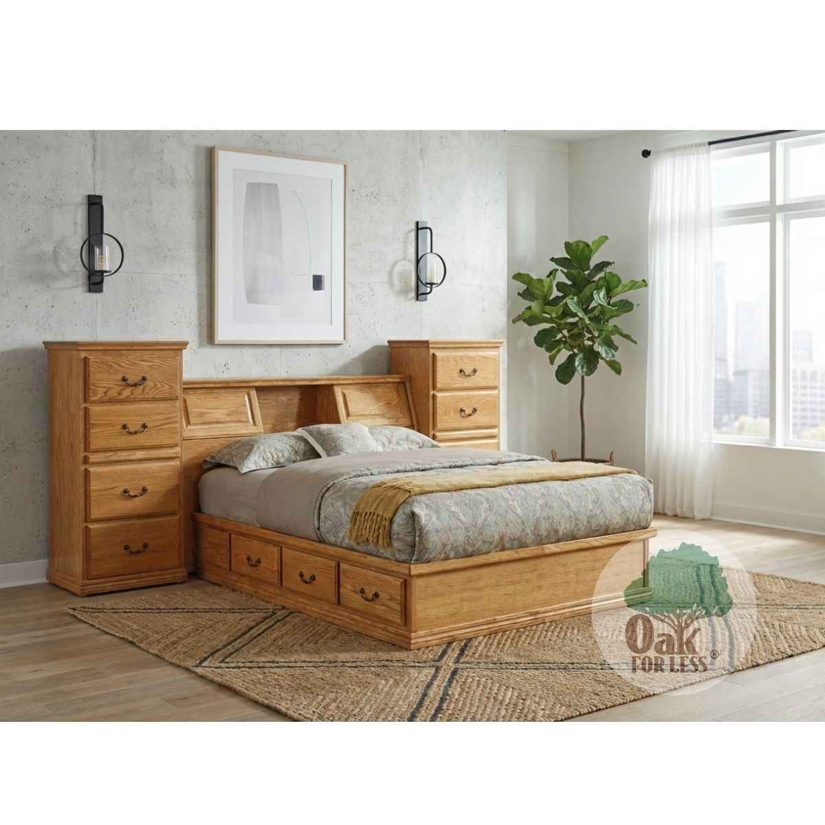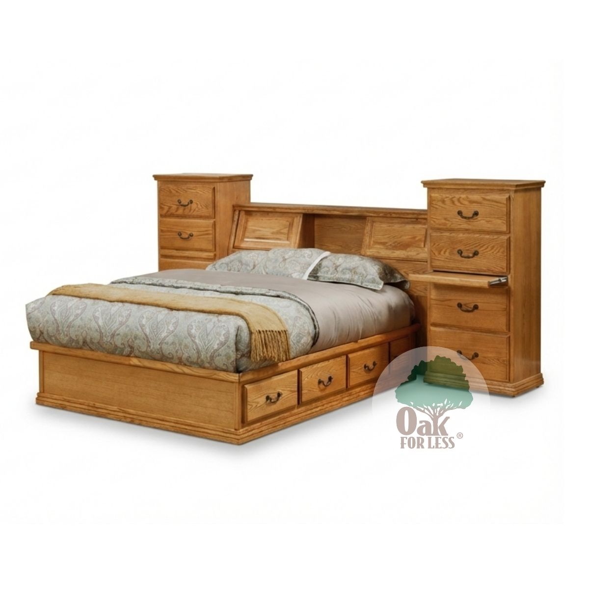 OD-O-T456-Q and OD-O-T475-Q - Traditional Oak Pedestal Bed with 3 piece Low Pier Wall Bookcase Headboard - Queen Size